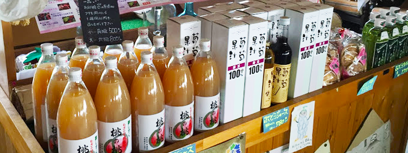桃ジュースや葡萄液、ワインもそろえています。試飲もできますので、お声掛け下さい。